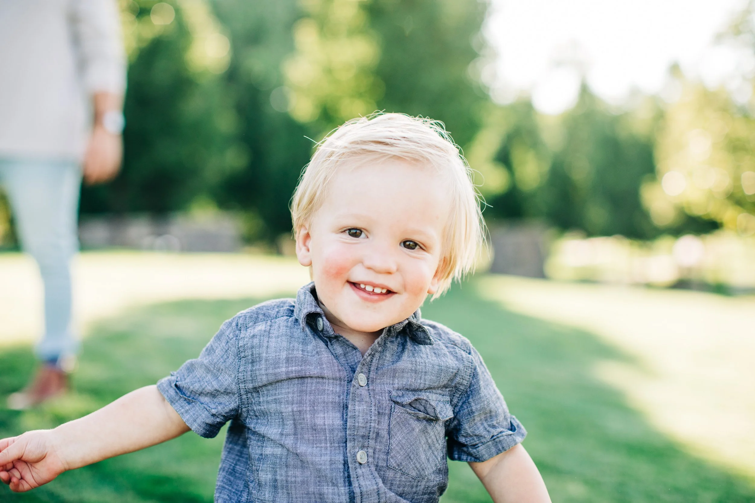 A young blonde boy in a blue plaid shirt smiling outdoors on a sunny day, with blurred trees and grass in the background.