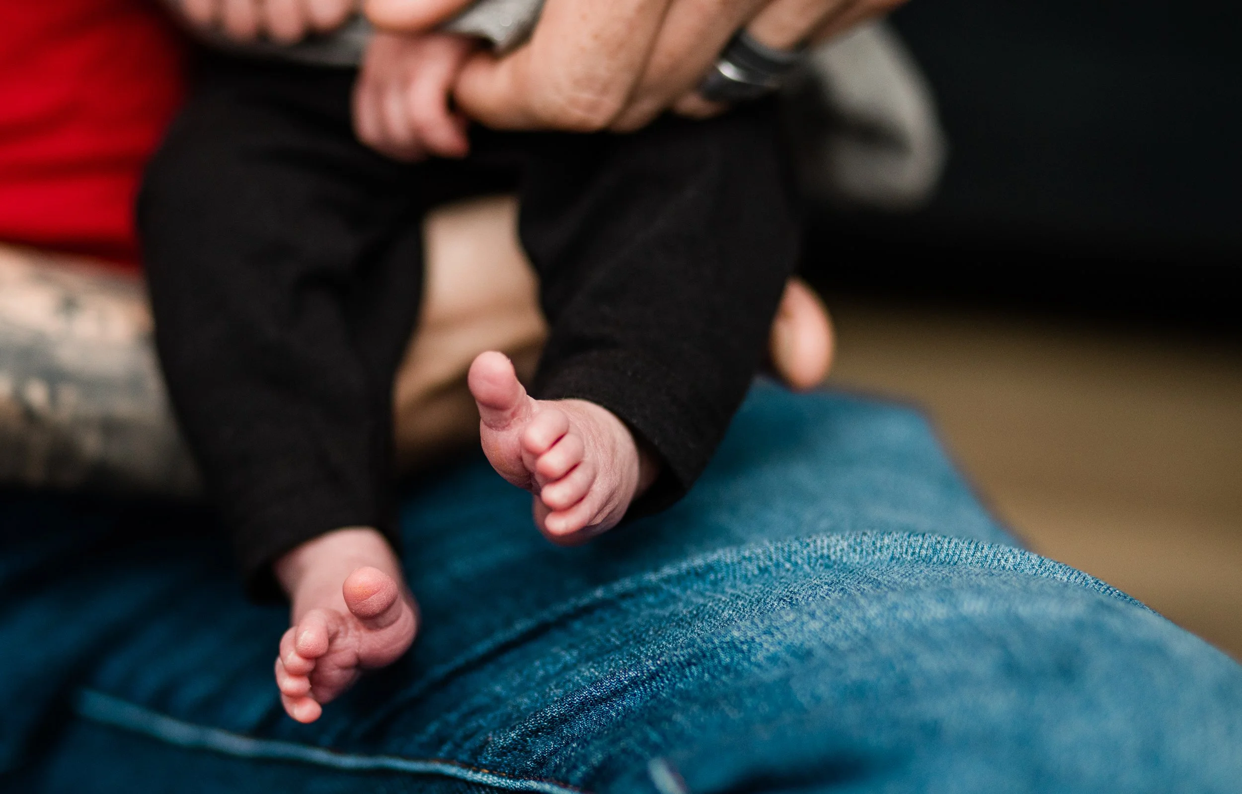 Close-up of a newborn baby's hands resting on a person's leg, with the baby's face out of frame.